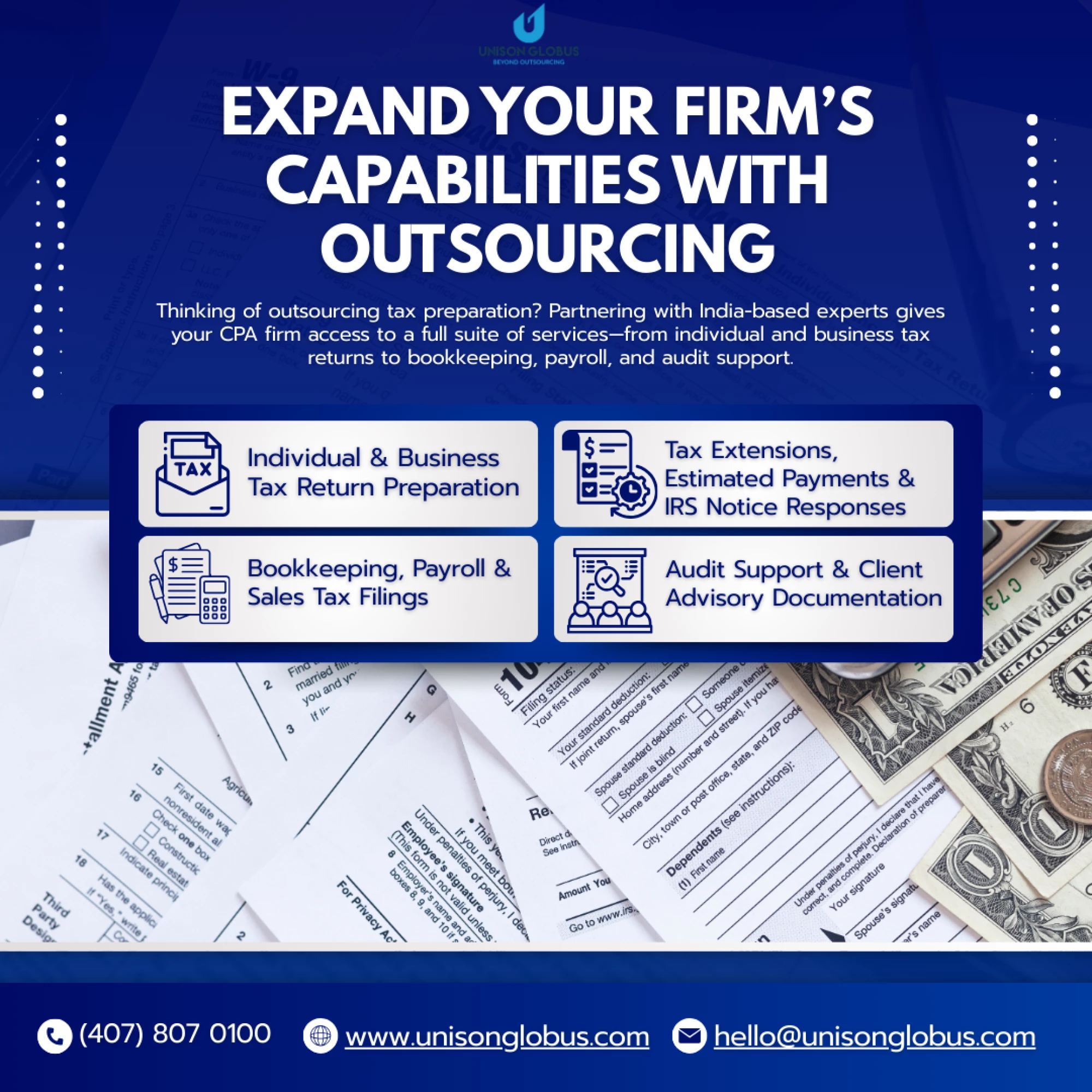 Stay prepared for rising IRS complexities and workload surges by outsourcing smarter. Unison Globus offers secure, scalable tax preparation support so your team can focus on high-value tasks like review, advisory, and strategic planning. Delegate time-consuming work such as accounting and bookkeeping, payroll, tax return preparation (1040, 1065, 1120-S), workpapers, reconciliations, and IRS notice responses to a trusted partner.