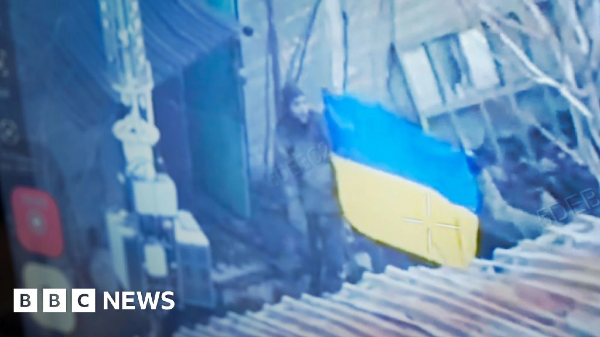 Over the radio, they ask two of their soldiers to break cover from a building to display a Ukrainian flag. They move quickly to avoid being spotted. The drone feed shows the moment they briefly wave their yellow and blue flag, before quickly returning to cover.