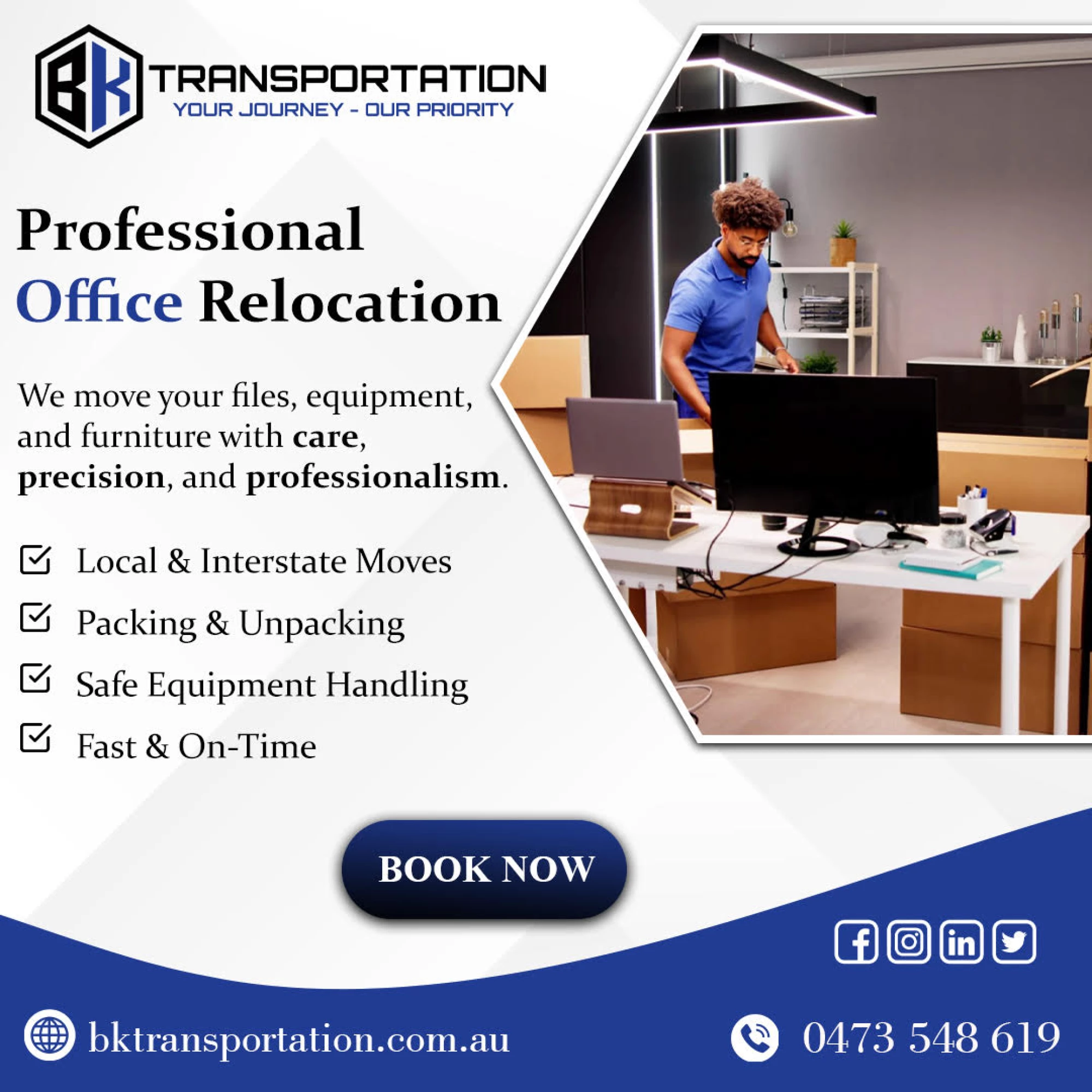 Looking for professional office removalists in Australia? BK Transportation offers fast, secure, and efficient office relocation services with minimal downtime. Expert movers for furniture, IT equipment, and business assets. Get a free quote today!