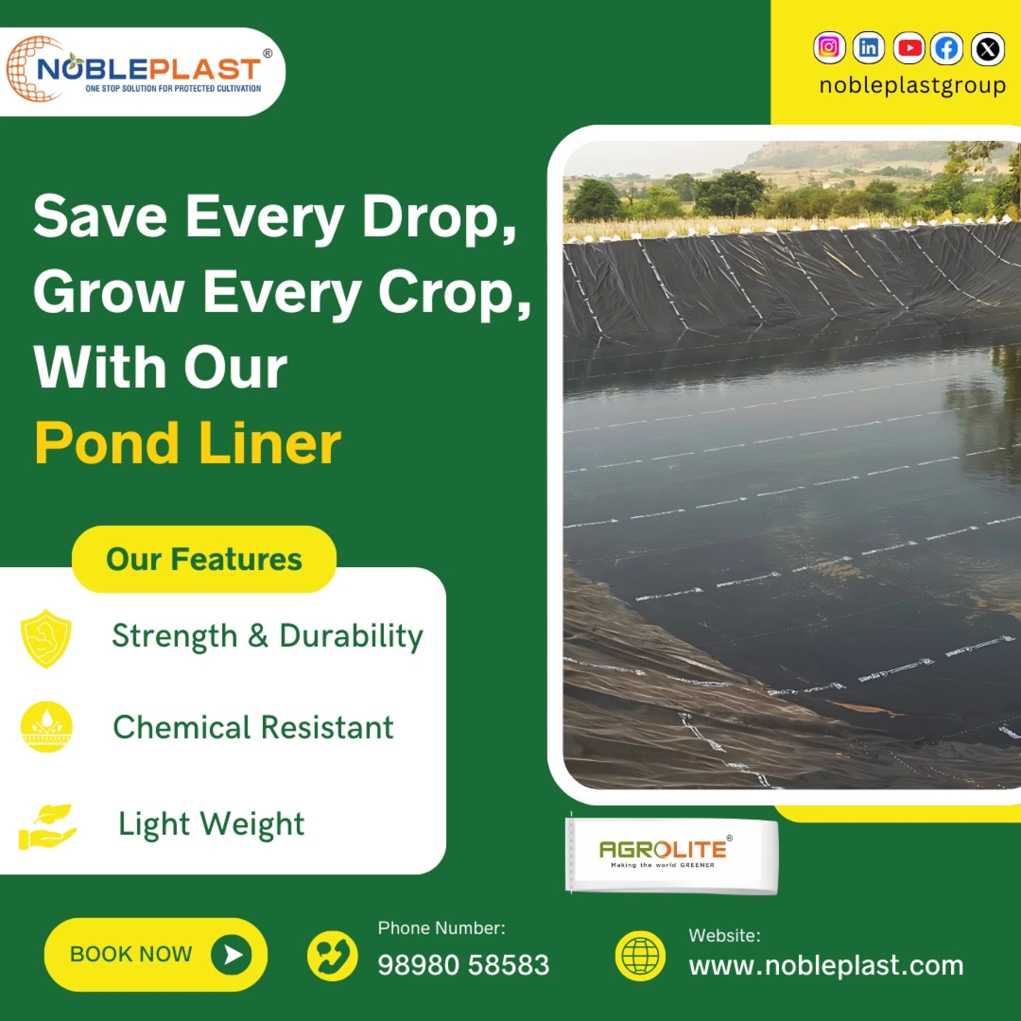 Nobleplast AgroLITE Pond Liner is a reliable water management solution designed to conserve water and improve agricultural efficiency. This high-quality HDPE pond liner helps prevent water seepage, ensuring maximum water retention for irrigation, fish farming, and rainwater harvesting. Ideal for farms, reservoirs, and agricultural ponds, it supports sustainable farming by saving every drop of water. Strong, lightweight, and easy to install, this pond liner is suitable for long-term outdoor use and harsh environmental conditions. Key Features: • High strength and superior durability • Chemical resistant and waterproof • Lightweight and easy to install • Reduces water loss and leakage • Suitable for agriculture ponds, irrigation tanks, and aquaculture • Long-lasting performance for efficient water storage