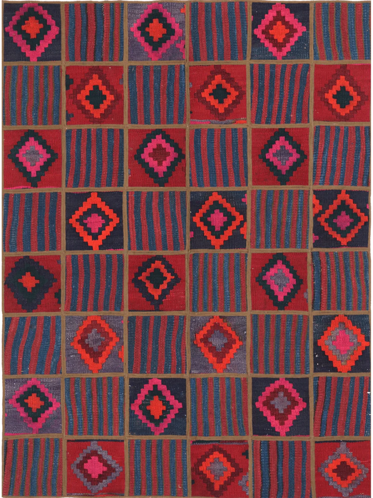 This one-of-a-kind 4x5 vintage Persian patchwork Kilim area rug showcases a striking geometric design, skillfully assembled from wool pieces. Featuring pink, rust, and blue hues, this handmade creation adds warmth and character to any space. Its patchwork construction highlights classic artistry. Soft yet durable, this rug seamlessly blends heritage with classic appeal. Free shipping in the US.