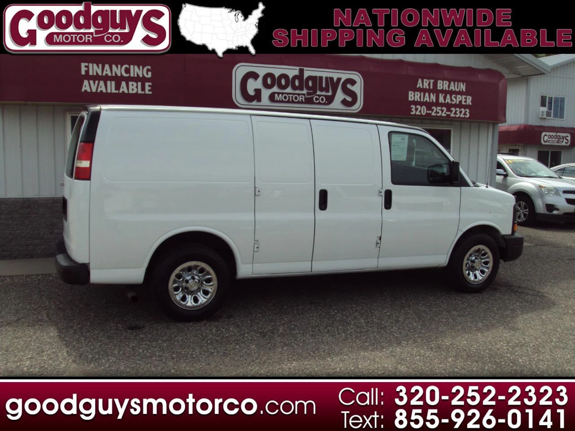 2013 Chevy Express AWD Cargo Van --> Cloth Interior!! This Chevy cargo van has been fully serviced at Goodguys Motor Company and is ready to hit the road, fresh oil change, new front and rear brake pads and rotors, new rear shocks, we serviced(new fluid) the front and rear diffs and t-case, new starter, Features include: 5.3L V8, automatic transmission, air conditioning, AM/FM stereo, cruise control, tilt wheel, bulkhead, rear shelves, daytime running lights, auto headlights, info center, ABS brakes, traction control. Also included is a 30 day or 1,000 mile Powertrain warranty (work must be done in our shop). Don't let this one pass you by.. Give us a call or stop in for a test drive! For more information please visit our website at http://www.goodguysmotorco.com or call 320-252-2323