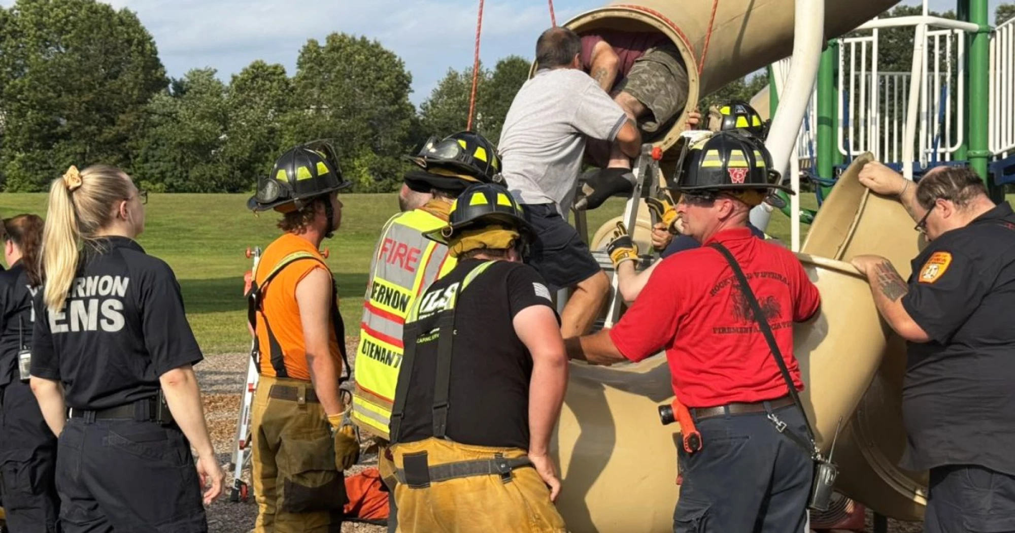 Rescuers found the 40-year-old man, who has not been publicly identified, “wedged feet and head first down the slide” while “stuck in the middle portion” when they responded to a call just after 4:30 p.m. Saturday at the Northeast Elementary School playground in Vernon, Connecticut, according to a statement from the Vernon Fire Department.