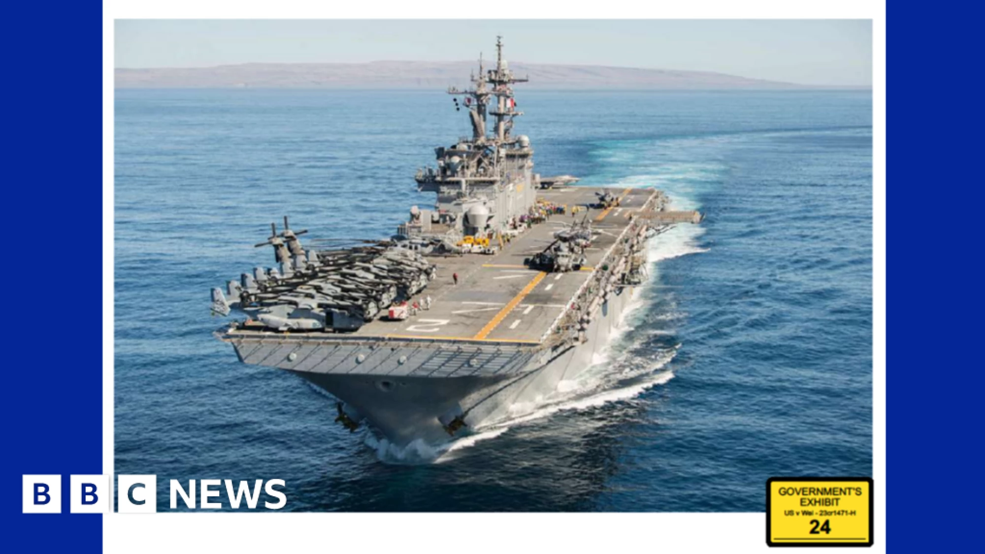 Watch LiveBritish Broadcasting CorporationHomeNewsSportBusinessInnovationCultureArtsTravelEarthAudioVideoLiveHomeNewsIsrael-Gaza WarWar in UkraineUS & CanadaUKUK PoliticsEnglandN. IrelandN. Ireland PoliticsScotlandScotland PoliticsWalesWales PoliticsAfricaAsiaChinaIndiaAustraliaEuropeLatin AmericaMiddle EastIn PicturesBBC InDepthBBC VerifySportBusinessExecutive LoungeTechnology of BusinessFuture of BusinessInnovationTechnologyScience & HealthArtificial IntelligenceAI v the MindCultureFilm & TVMusicArt & DesignStyleBooksEntertainment NewsArtsArts in MotionTravelDestinationsAfricaAntarcticaAsiaAustralia and PacificCaribbean & BermudaCentral AmericaEuropeMiddle EastNorth AmericaSouth AmericaWorld’s TableCulture & ExperiencesAdventuresThe SpeciaListEarthNatural WondersWeather & ScienceClimate SolutionsSustainable BusinessGreen LivingAudioPodcast CategoriesRadioAudio FAQsVideoLiveLive NewsLive SportHomeNewsSportBusinessInnovationCultureArtsTravelEarthAudioVideoLiveWeatherNewslettersWatch LiveUS Navy sailor convicted of spying for China14 hours agoShareSaveRegan MorrisBBC News, in Los AngelesShareSaveUS Justice DepartmentUSS Essex shown in government evidence against Jinchao WeiA US Navy sailor in California has been convicted of espionage for selling secrets to a Chinese agent who recruited him through social media.