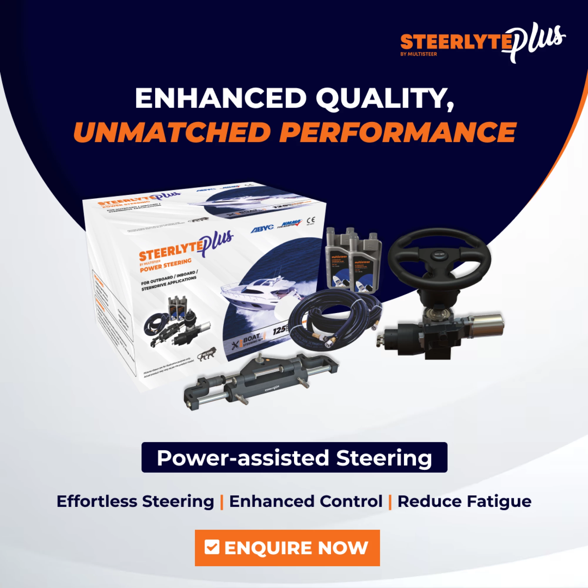 Power Assisted boat steering system Steerlyte Plus is a revolutionary product for Outboards and Inboards, suitable for Single, Twin, Triple or Quad motors